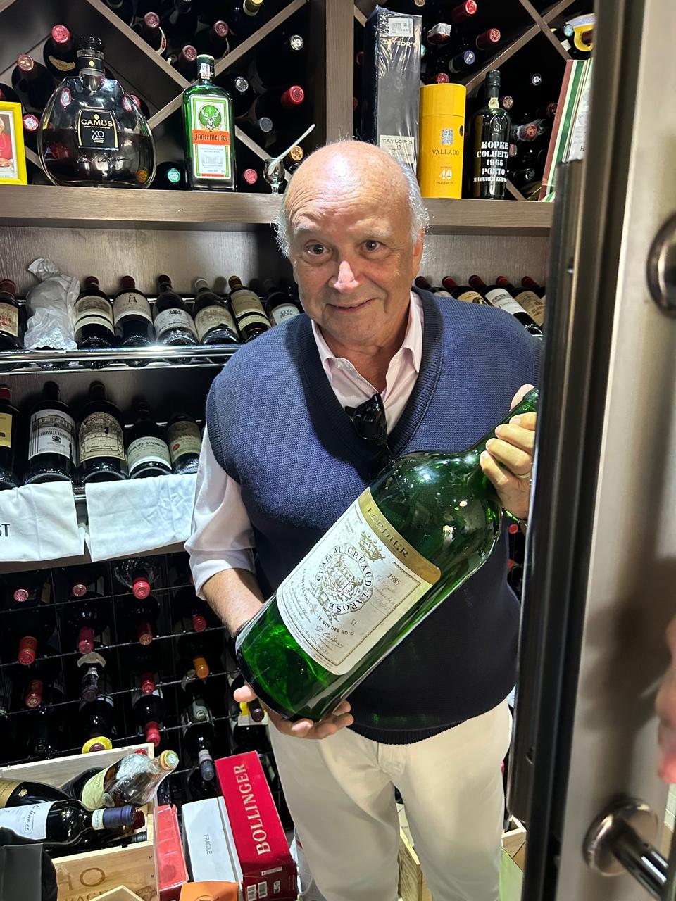 Cuidado – Ubirajara Formiga, carinhosamente conhecido como Bira, transita com elegância pela adega de um amigo em comum, onde se encontram armazenadas centenas de preciosidades. Cuidado, Bira! Com tantas joias à sua disposição, a tentação de experimentar um pouco de tudo pode ser irresistível!