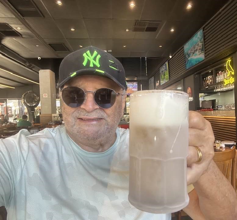 Treino intenso – Dividido entre Jampa e Brasília, meu amigo Ubirajara Formiga está levando a sério sua preparação para a “chegada dos 7.6 que acontecerá no dia 29 de outubro”. Após quase 10 km de caminhada rápida, ele faz uma pausa estratégica para se reidratar com um chope gelado, um merecido refresco após o esforço.