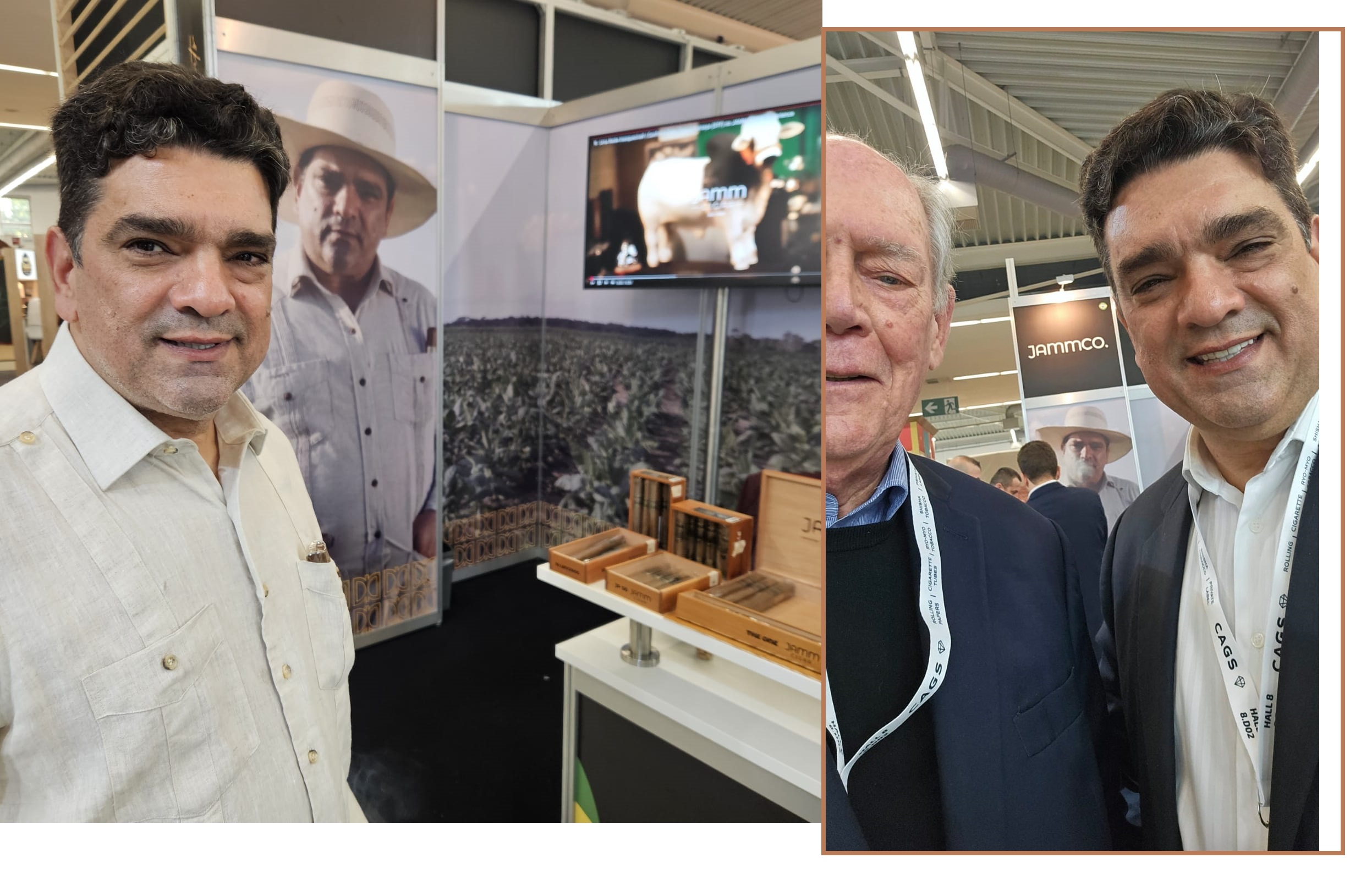 Coisas do vinho II – Ainda sobre o Wine Music Brasil, uma conversa telefônica com meu amigo William Riley, um expert em fabricação de cigarros, resultou em um encontro em Dortmund entre ele e José Antônio Martins Monteiro, conhecido como Mr. JAMM. Na foto, Riley aparece no estande de Charutos JAMM, durante a feira em que ambos participaram. Negócios em vista!